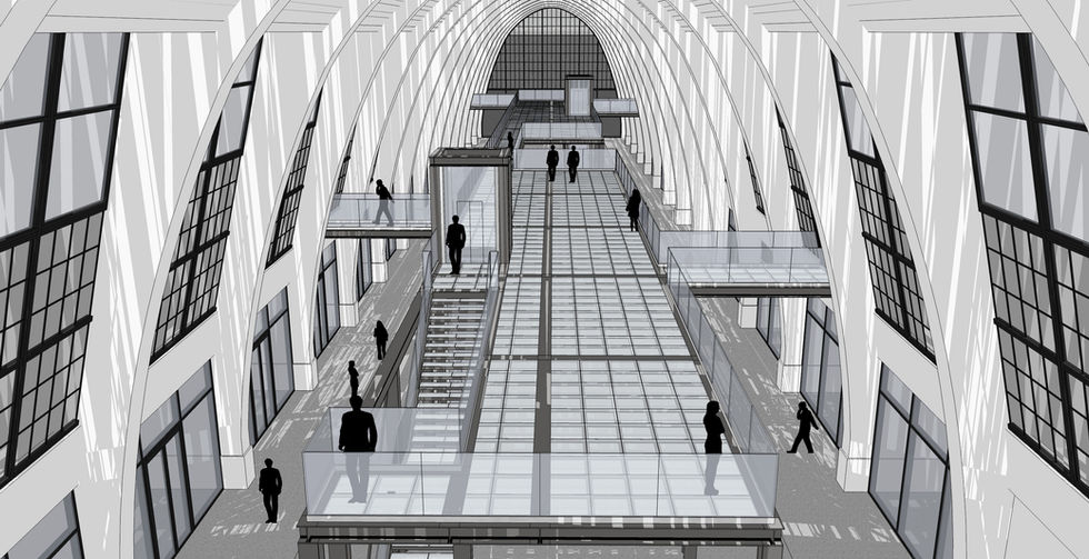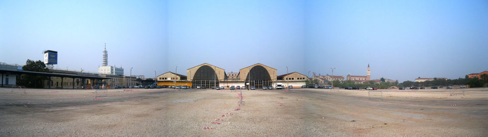 The project concerns the requalification of an abandoned industrial area which could become a new part of the city, with a big area to be used as a public park, an underground parking, new office buildings, a new connection with the Fair and a covered square in the old parabolic structures, which was meant to be a new Forum. This place, once dedicated to a market, was thought to perform the function of aggregation and meeting it had in the past. The new glazed inserts float like clouds in the existing space without touching the structure, offering a new elevated walkway that allows to appreciate from a different point of view the series of parabolic arches.