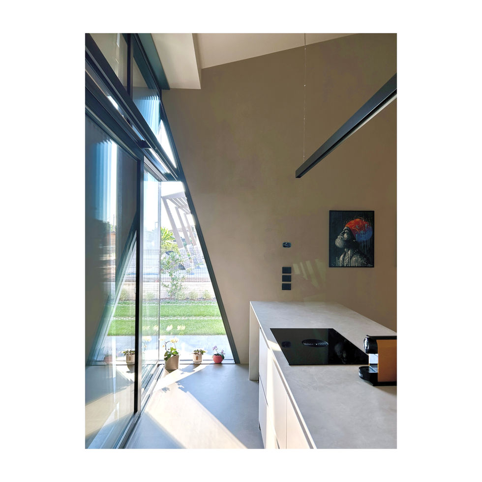 The living area is shaded thanks to the southward inclination of the building, which is highlighted by a brise-soleil that gives the building dynamism and momentum. The shading system on the main south-facing façade optimizes natural sunlight during the winter and, conversely, protects the glass façade during the summer. The inclination of the sun is therefore the element from which the building takes its shape.